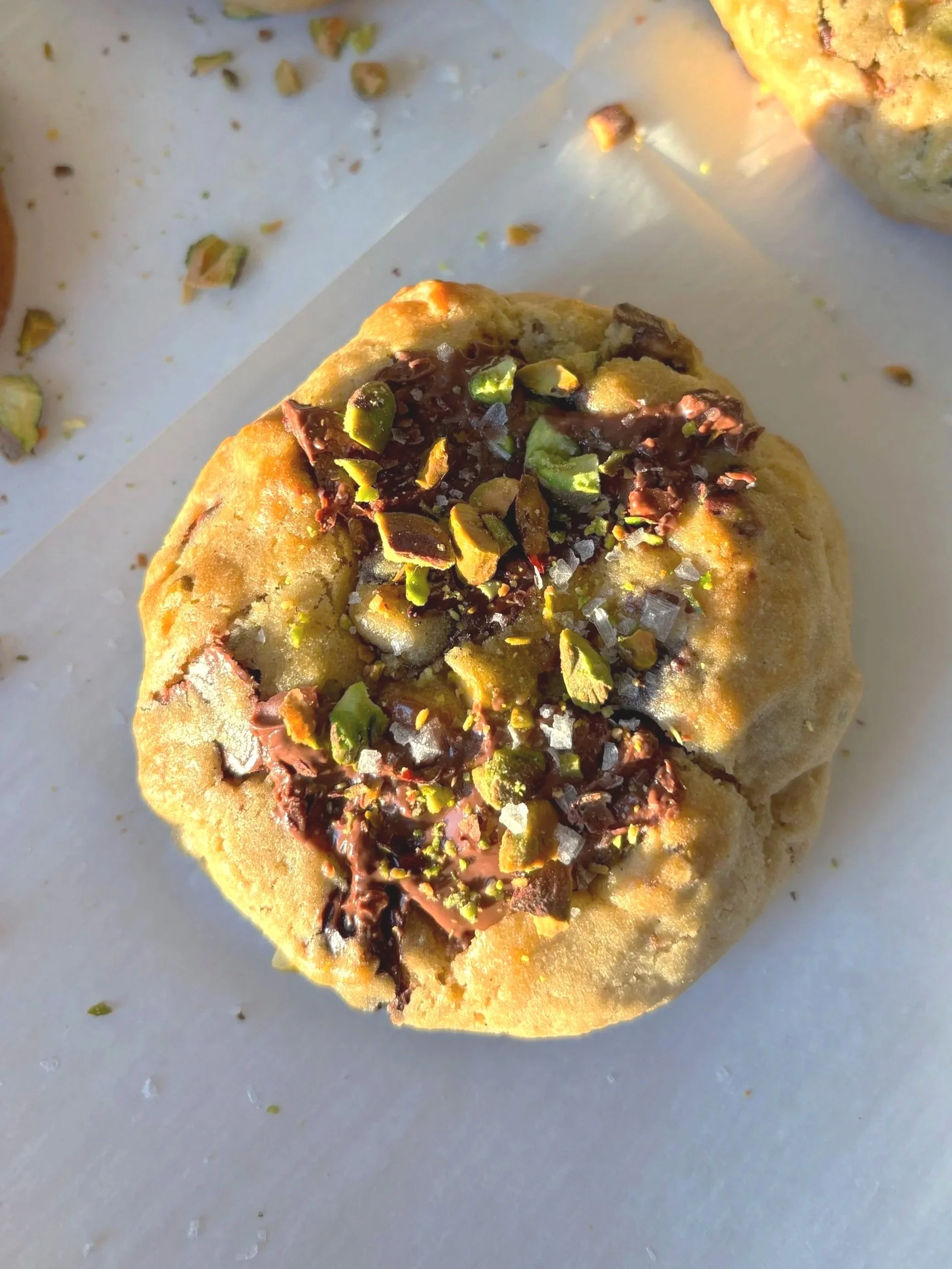 Milk Chocolate Chunks, Dark Chocolate Chips, crushed Pistachios, stuffed with Pistachio Cream, topped with Sea Salt.